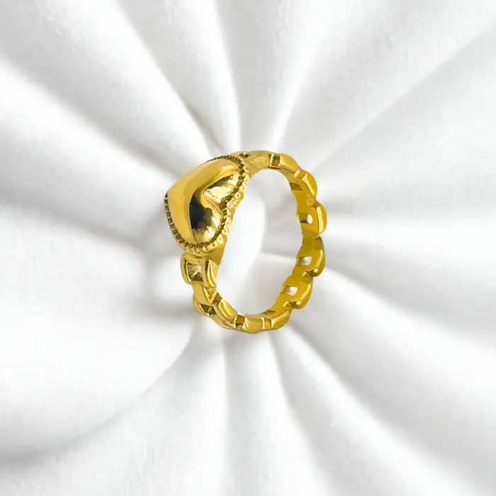 Our Sheura Event Ready Heart Expression Ring is a sweet little charm with a bold twist. Crafted in gold-plated stainless steel, this ring features a detailed heart design on a unique chain-style band — giving it a cool, edgy look with a touch of love.