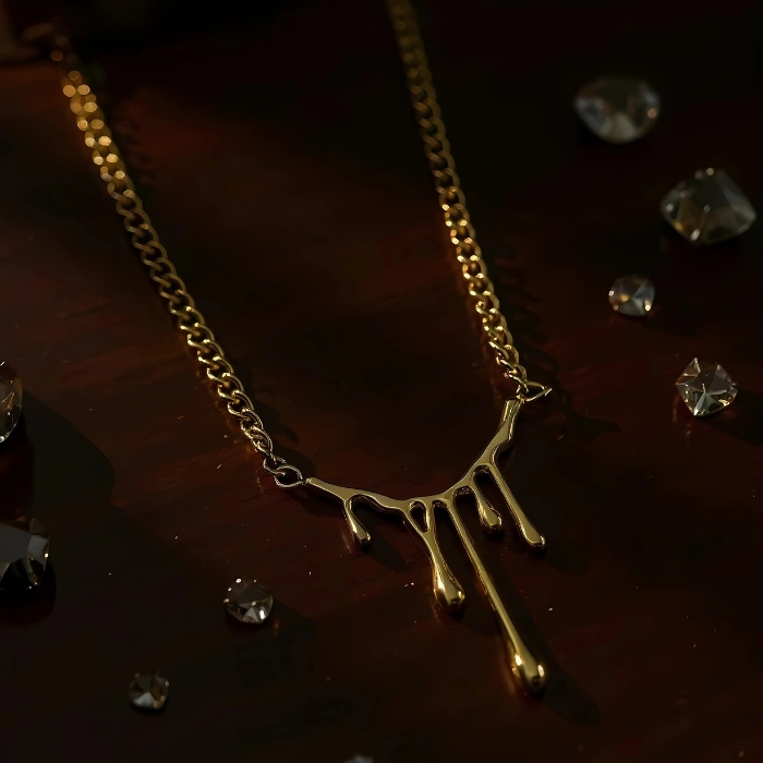 This necklace has a cool melting design that looks like liquid gold dripping. It hangs on a simple gold chain and adds a modern touch to any outfit.