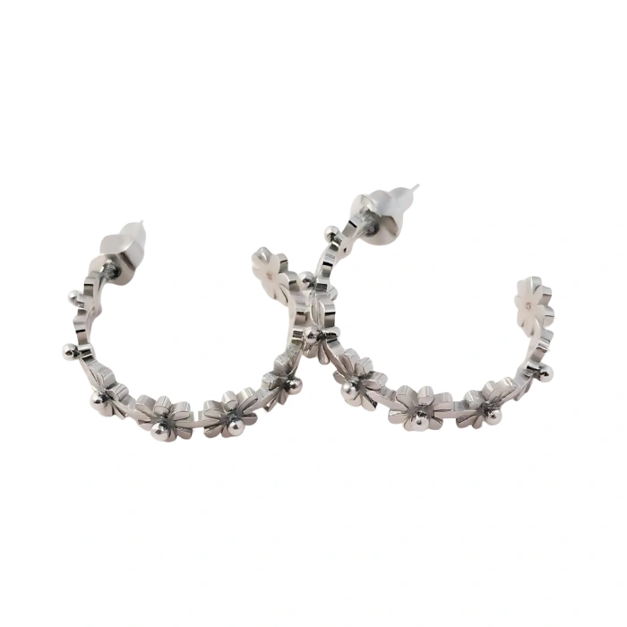 Add a fresh twist to your style with these silver demi-fine floral hoop earrings. Featuring a delicate row of tiny flowers, these hoops are both playful and polished—just the right mix of cute and classy. Part of Sheura’s Wildscape collection, they’re perfect for making a subtle statement at any event.